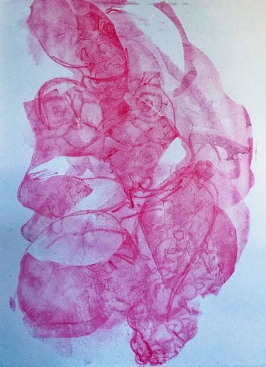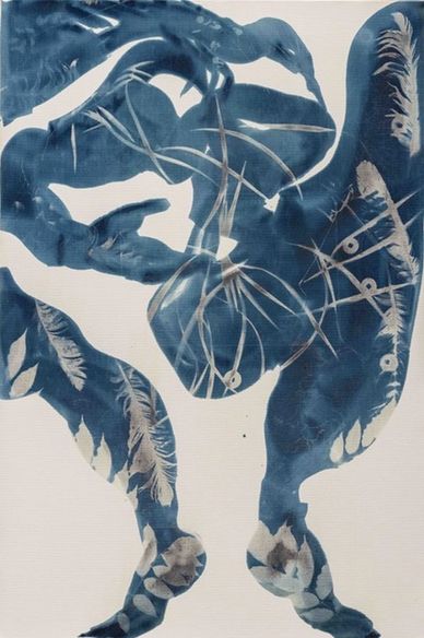 Description: Figurative suggestion and bird shape. First I collected found Cockatoo feathers and local flora from my daily walks. Then painting the light-sensitive medium on the canvas I placed the objects on the canvas that block out the light and then let the sun develop the colour. This is a memory to me of my walks around my home.