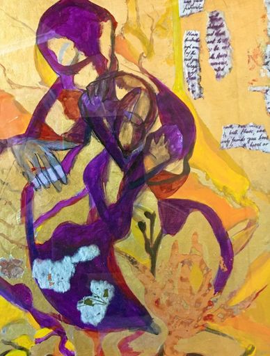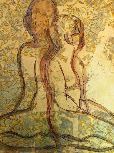 Description: Though the composition shows two people back to back perhaps I've got your back would also be suitable as I intended the composition to be strong, upright and supportive in emotion and structure. I am excited to use the metal leaf which is so interesting as it changes as you move around, shimmering and dulling depending on the lighting and the amount of wash I use to reduce reflection. Using metal leaf the possibilities and effects can create a sea of difficulties that inspire me to learn how to use it.
