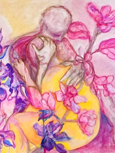 I am still keeping the triangle shape in the overall composition, adding openness with the overlay of floral shapes to create fresh feelings to lighten and calm the emotional charge.