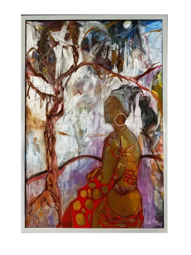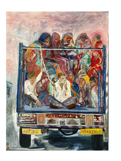 Description: One of three on canvas in this series (photo from Michale Bauer inspired these large works). This painting is visually different all about displacement herded women and control.