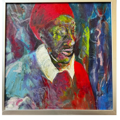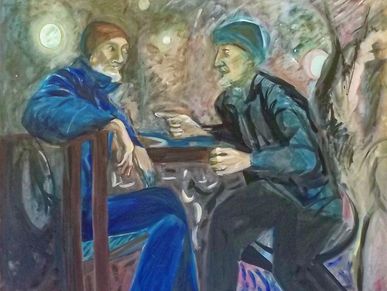 Description: Observing these two long-time friends hold fascinating intense conversations, like academics, discussing and sparing on the deeper meanings questions of life on earth and throughout the galaxy. Here I reference a long ride on their Triumphs. Still wearing the winter bike gear gave me licence to play with the textures of the acrylic paint on canvas which I like to use as it is such a contrast to the ubiquitous screens we are all surrounded by. Mostly my works are narrative. You may see a third character to add ambiguity to the story.