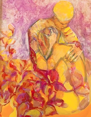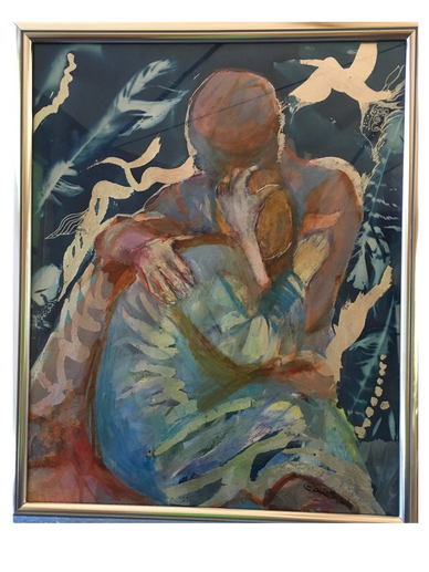 Description: My Comfort series stems from my emotions after watching a soldier comforting a friend. Why compassion/empathy. Ask the question 'are you OK'? What can I do? Do I know what you're thinking? Of course not. Hold Held Nurture Love, Protect touch touched, Isolation shock trauma separation alone single endure align encourage cover together, Warm cosy safe. This is after the global pandemic. I always enjoy using figures in my paintings, especially to enhance an emotion.