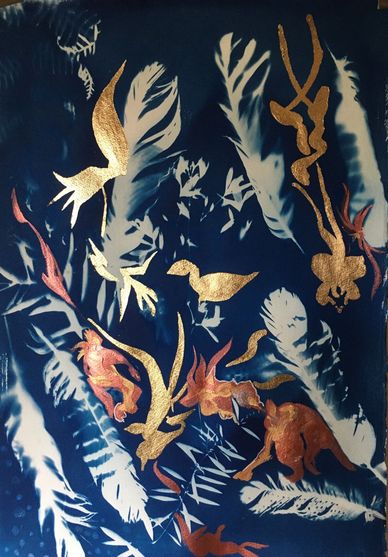 Medium: Cyanotype on paper with gold leaf and metal paints