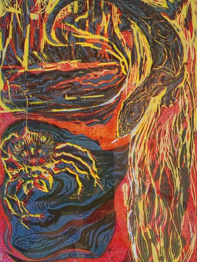 Description: (Edition of five) In the SW of West Australia we have amazing spiders, the now very popular peacock and the jumping spiders. Now recognised as intelligent. Watching them and after reading the novel “Children of Time” by Adrian Tchaikovsky led me to produce the lino cut Portia. Showing the spider and the Lizard.